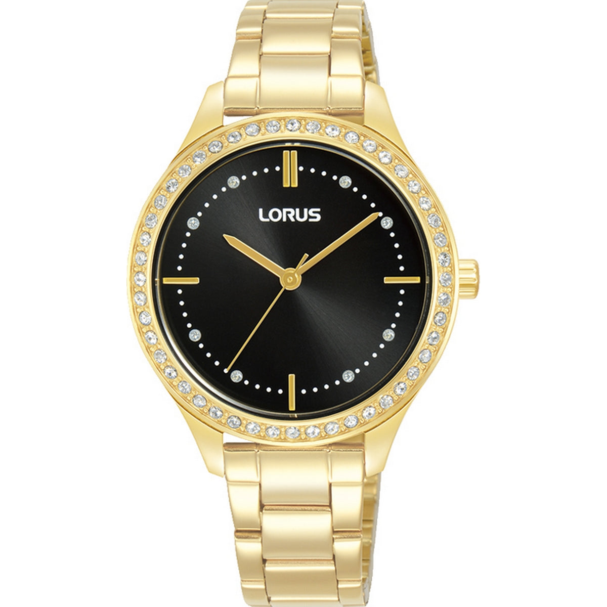LORUS QUARTZ LADIES GOLD PLATED BLACK DIAL BRACELET WATCH