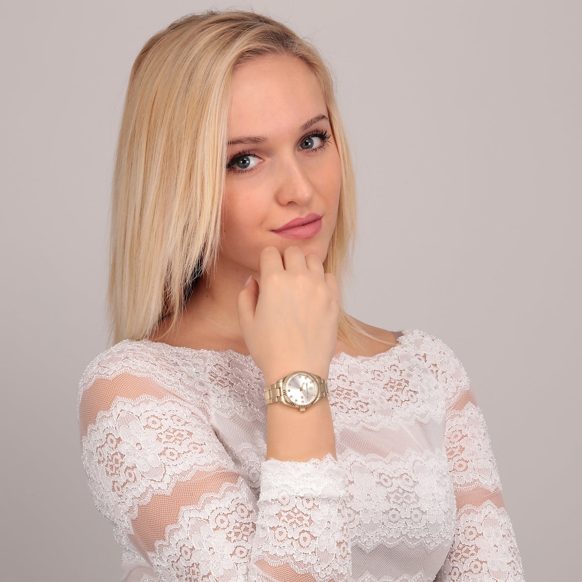 MOVEMENT TYPE: Quartz MOVEMENT CALIBRE: BAND TYPE: Gold Plated Bracelet CLASP TYPE: Three Fold Clasp with Secure Lock and Slide Adjust DIAL COLOUR: Silver WATER RESISTANCE (Metres): 100 CASE WIDTH: 31mm CASE DEPTH: GLASS TYPE: Mineral Crystal DATE FUNCTION: Date Only STONE TYPE: