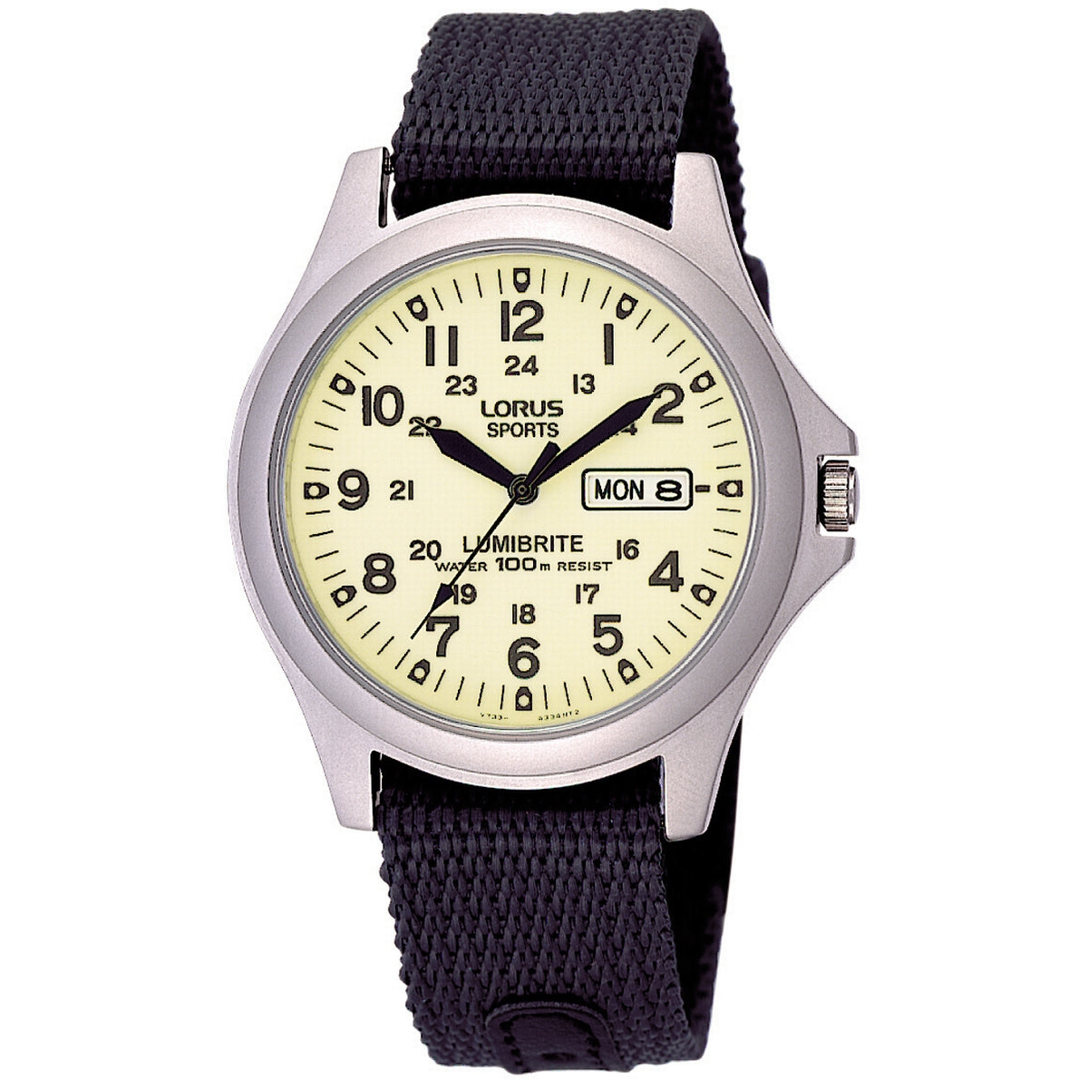 lorus gents 50m stainless steel on strap, full figure black dial watch