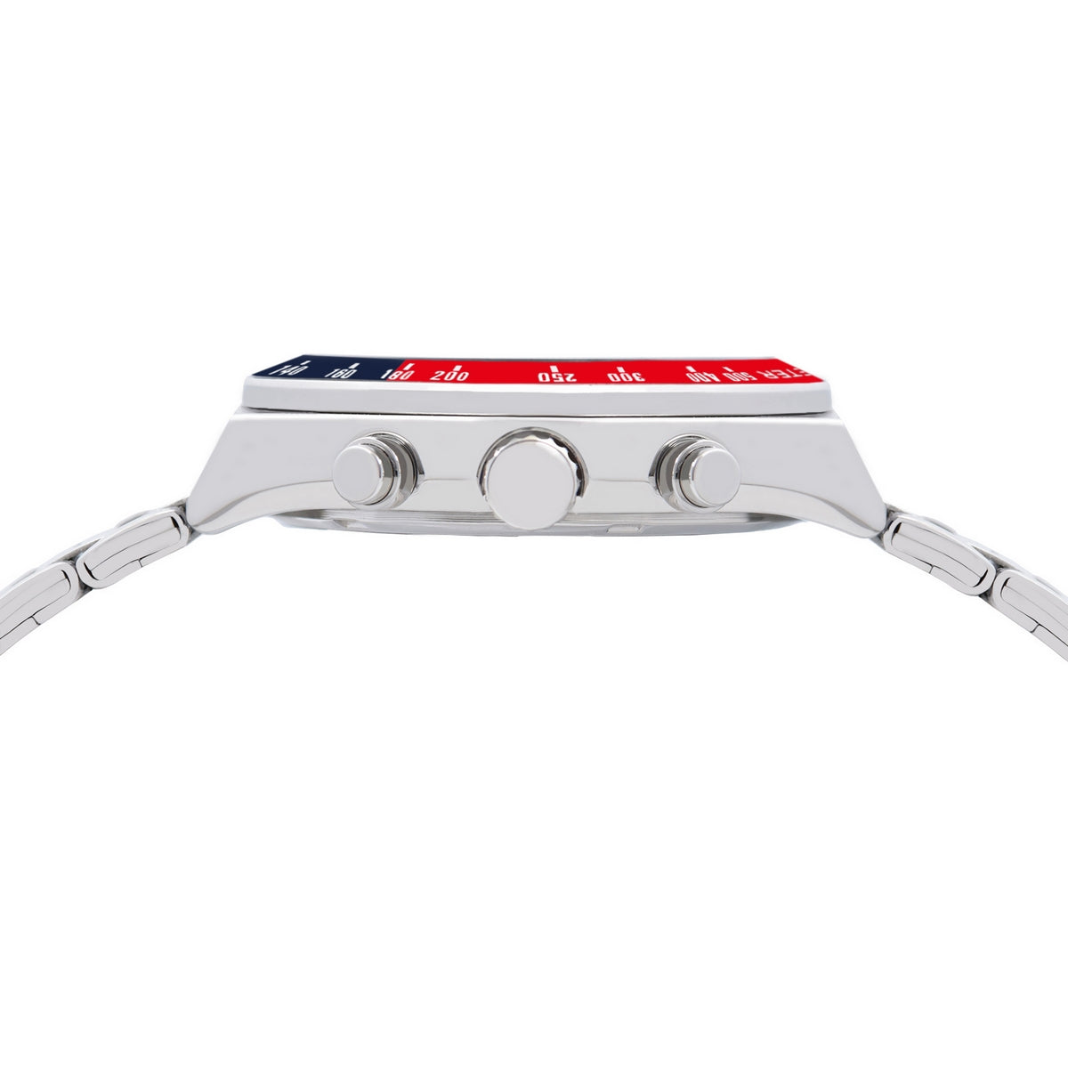 MOVEMENT TYPE: Quartz MOVEMENT CALIBRE: PC33 BAND TYPE: Stainless Steel Bracelet CLASP TYPE: Z-Clasp DIAL COLOUR: Red WATER RESISTANCE (Metres): 100 CASE WIDTH: 41mm CASE DEPTH: 10.7mm GLASS TYPE: Mineral Crystal DATE FUNCTION: Day and Date STONE TYPE: