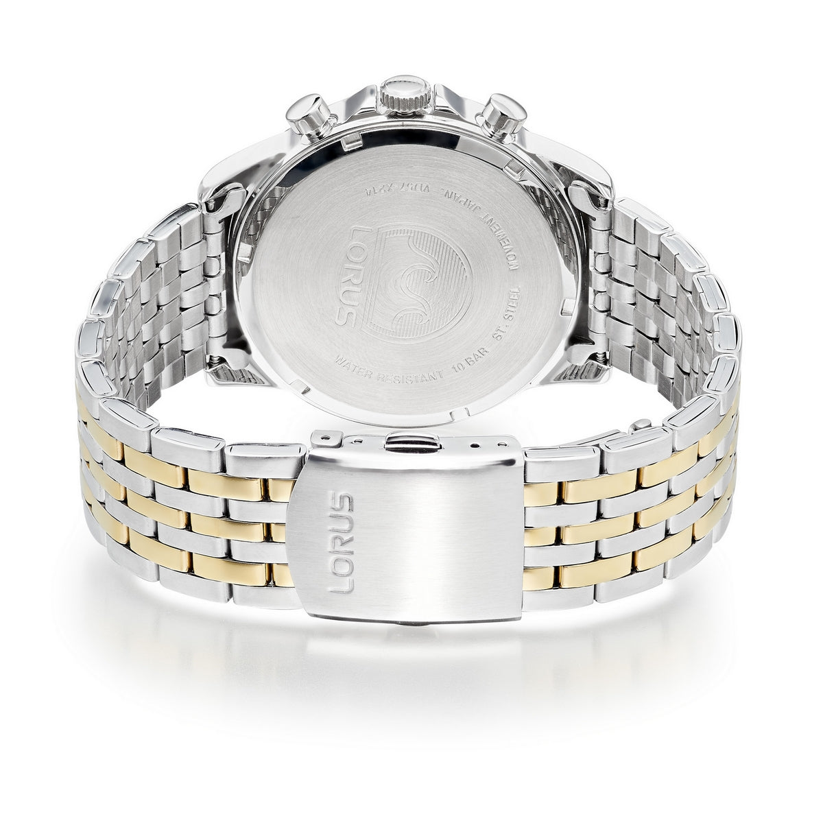 lorus chronograph gents two tone stainless steel white dial brcelet watch