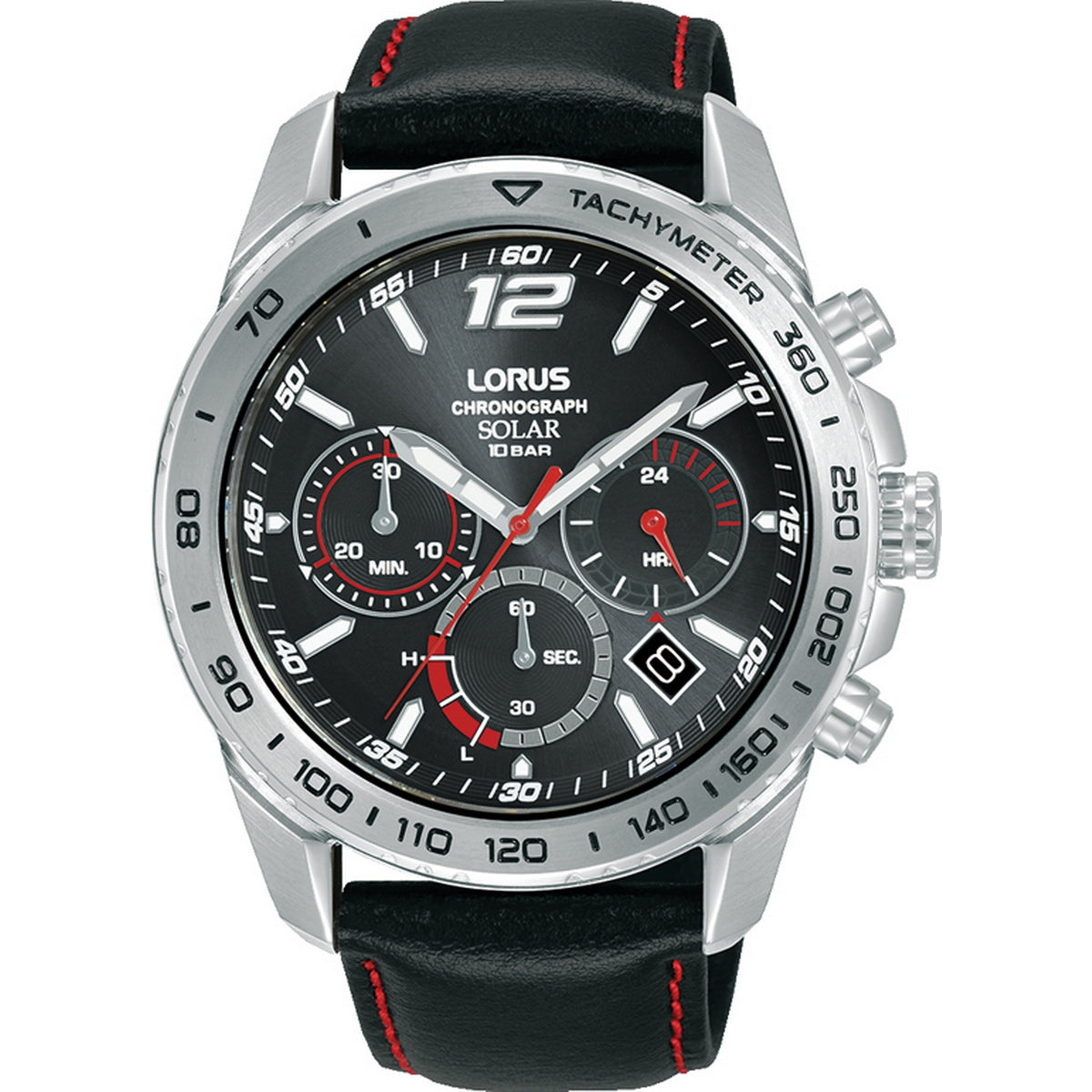 lorus solar chronograph gents stainless steel black dial strap watch