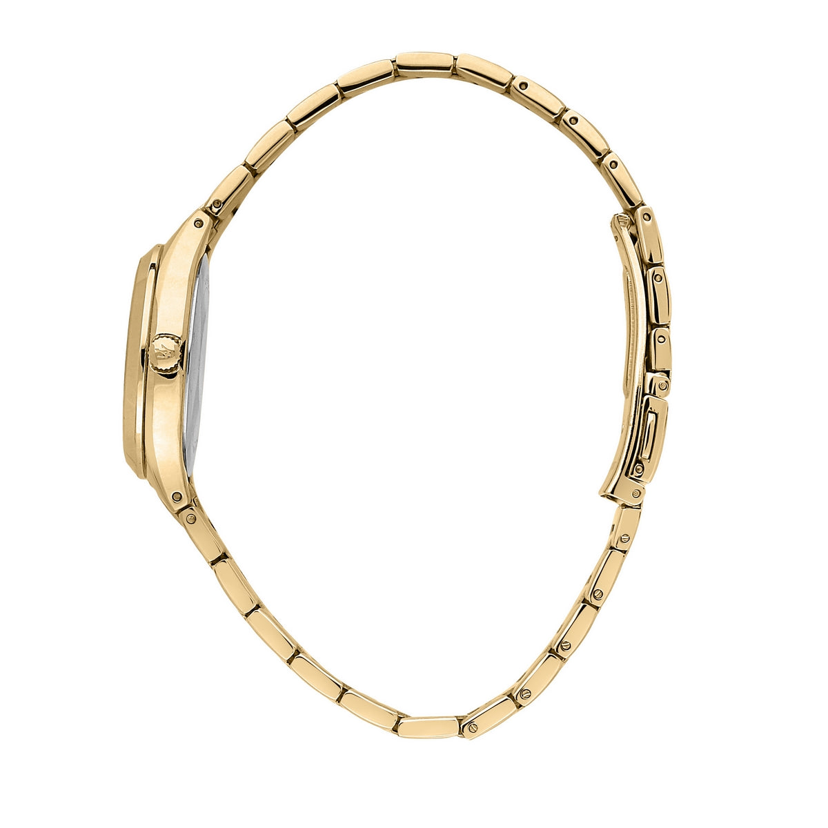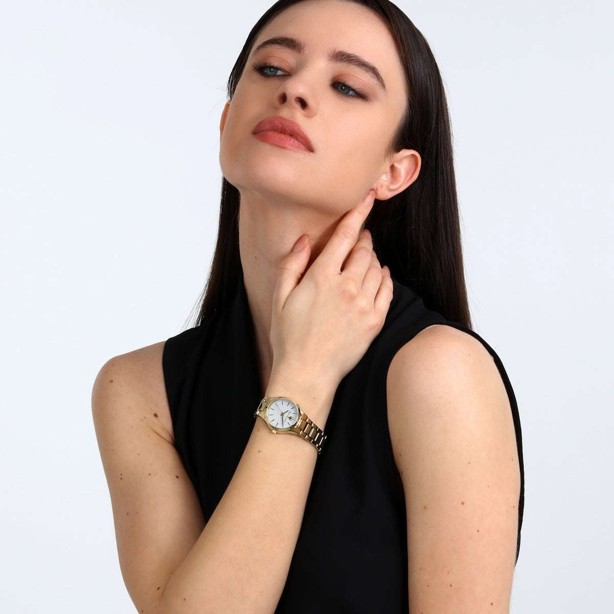 MOVEMENT TYPE: Quartz MOVEMENT CALIBRE: BAND TYPE: Gold Plated Bracelet CLASP TYPE: Z-Clasp DIAL COLOUR: White WATER RESISTANCE (Metres): 100 CASE WIDTH: 34mm CASE DEPTH: 6mm GLASS TYPE: Mineral Crystal DATE FUNCTION: STONE TYPE: