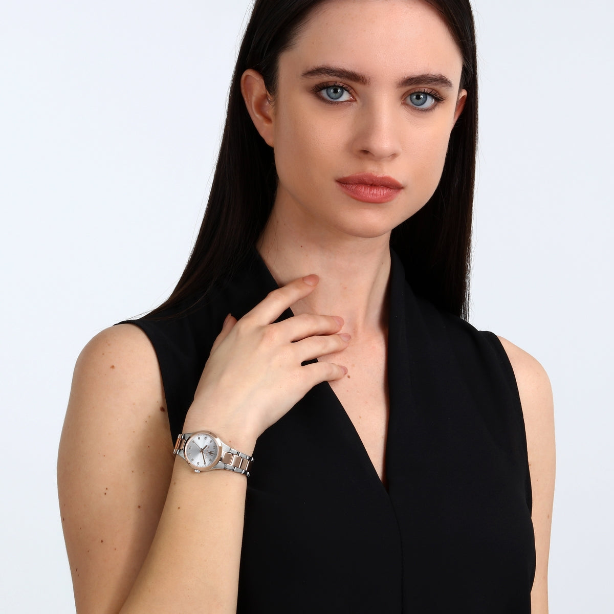 MOVEMENT TYPE: Quartz MOVEMENT CALIBRE: BAND TYPE: Mixed Metal Bracelet CLASP TYPE: Three Fold Clasp with Secure Lock and Slide Adjust DIAL COLOUR: Silver WATER RESISTANCE (Metres): 100 CASE WIDTH: 31mm CASE DEPTH: GLASS TYPE: Mineral Crystal DATE FUNCTION: Date Only STONE TYPE: