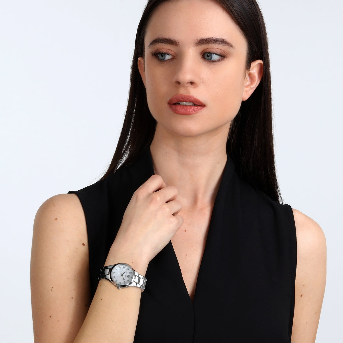 MOVEMENT TYPE: Quartz MOVEMENT CALIBRE: BAND TYPE: Stainless Steel Bracelet CLASP TYPE: Three Fold Clasp with Secure Lock and Slide Adjust DIAL COLOUR: Silver WATER RESISTANCE (Metres): 100 CASE WIDTH: 31mm CASE DEPTH: GLASS TYPE: Mineral Crystal DATE FUNCTION: Date Only STONE TYPE: