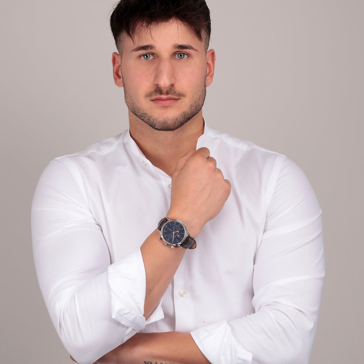 MOVEMENT TYPE: Quartz MOVEMENT CALIBRE: Miyota JS20 BAND TYPE: Leather Strap CLASP TYPE: Buckle DIAL COLOUR: Cream WATER RESISTANCE (Metres): 100 CASE WIDTH: 42mm CASE DEPTH: GLASS TYPE: Acrylic DATE FUNCTION: STONE TYPE: