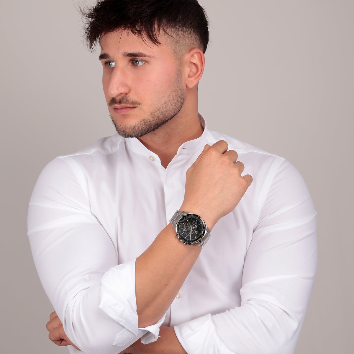 MOVEMENT TYPE: Quartz MOVEMENT CALIBRE: BAND TYPE: Stainless Steel Bracelet CLASP TYPE: Z-Clasp DIAL COLOUR: Black WATER RESISTANCE (Metres): 100 CASE WIDTH: CASE DEPTH: GLASS TYPE: Mineral Crystal DATE FUNCTION: Date Only STONE TYPE: