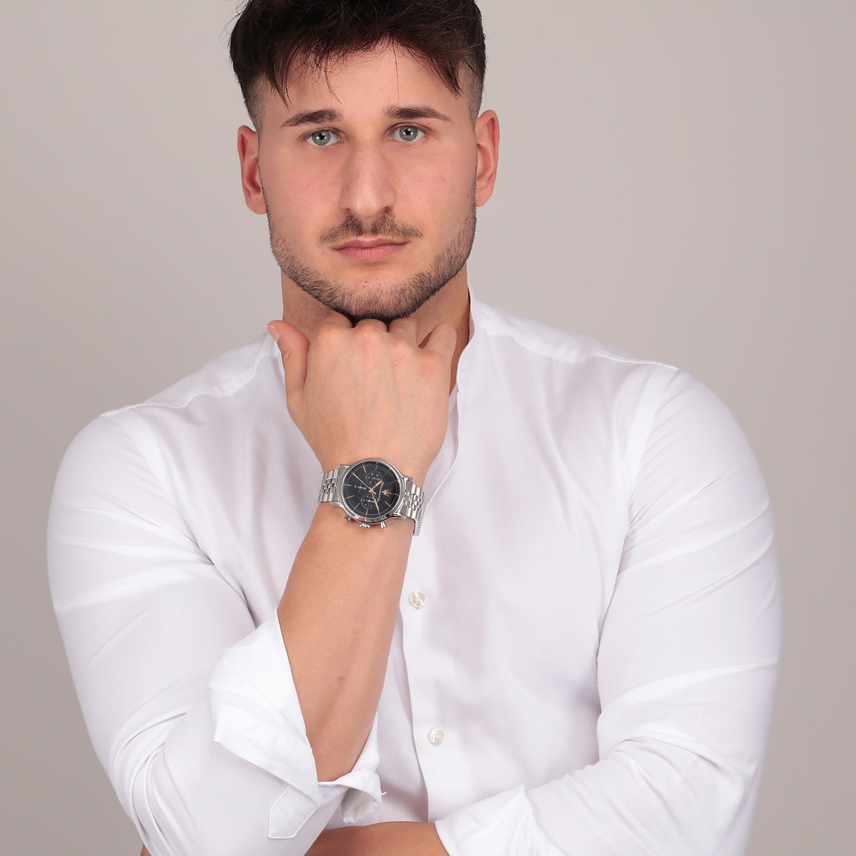 MOVEMENT TYPE: Quartz MOVEMENT CALIBRE: BAND TYPE: Stainless Steel Bracelet CLASP TYPE: Z-Clasp DIAL COLOUR: Silver WATER RESISTANCE (Metres): 50 CASE WIDTH: 43mm CASE DEPTH: GLASS TYPE: Mineral Crystal DATE FUNCTION: STONE TYPE: